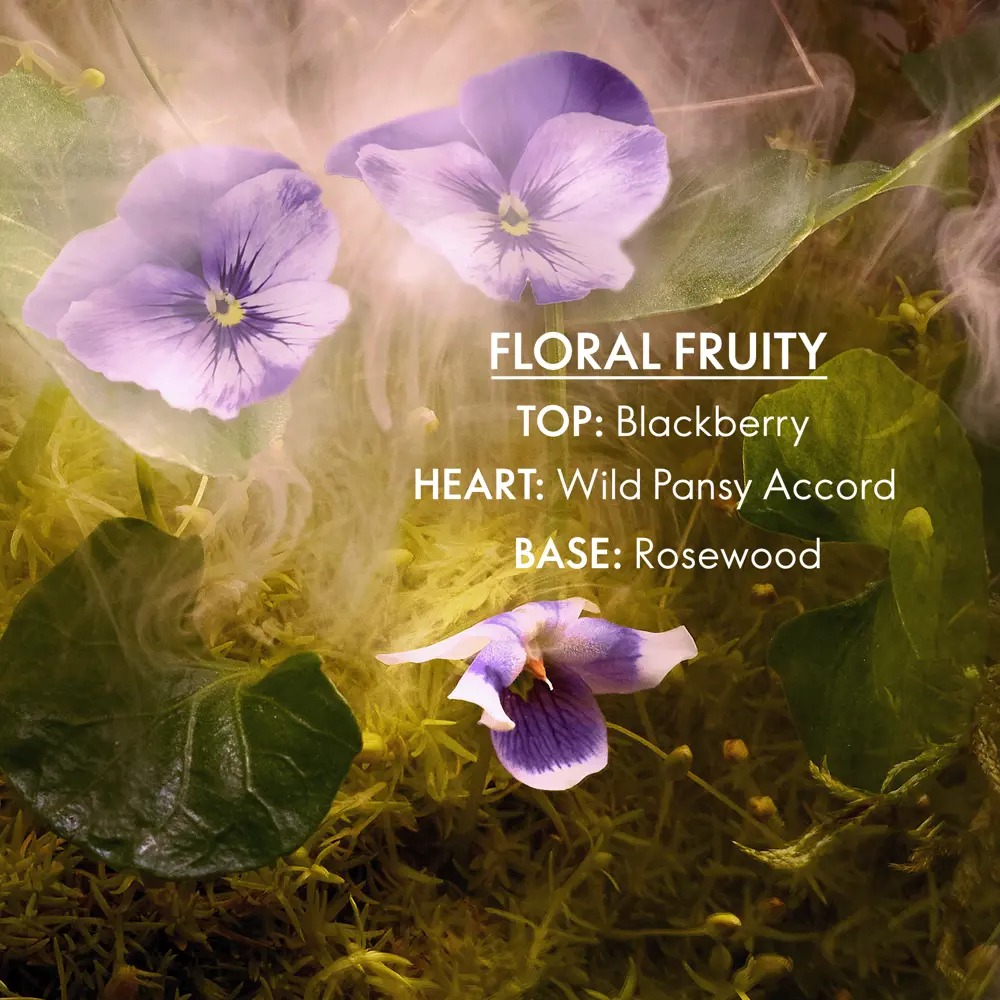 A magical Eau de Toilette experience awaits you with the fascinating violet bouquets of delicate Wild Pansy Violet intertwined with velvety dark forest fruits. This dreamy feminine scent, fascinating and mysterious, will take you to the fairy world.